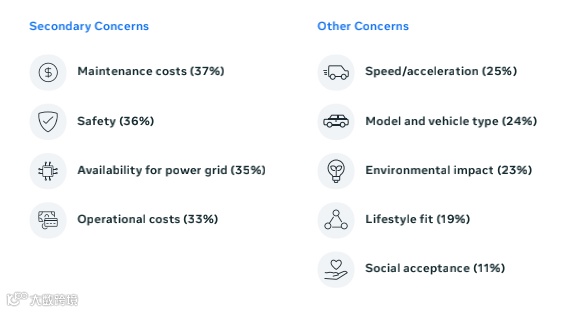 而他们次要关注的问题则与购买后的日常体验有关,如37%的受访者关注新能源汽车的维修费用;36%的人关心其安全问题;33%的人关注使用成本问题。