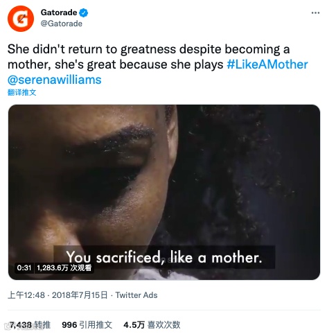 运动饮料品牌佳得乐抓住了这一趋势,选择与小威廉姆斯合作推出以#LikeAMother 为话题的广告短片,最终在Twitter上收获了1200万+次播放和4万+点赞。