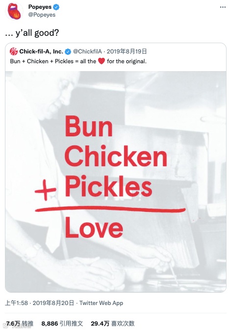 Popeyes不甘示弱,直接转推并配文三个字“y'all good?”(你们还好吗?)将质疑和“嘲讽”拉满,围观群众们也嗅到了十足的火药味,纷纷为其点赞。在当时,这条推文在短短几个小时内获得了7万+转推和29万+点赞,并火速点燃了整个Twitter平台。