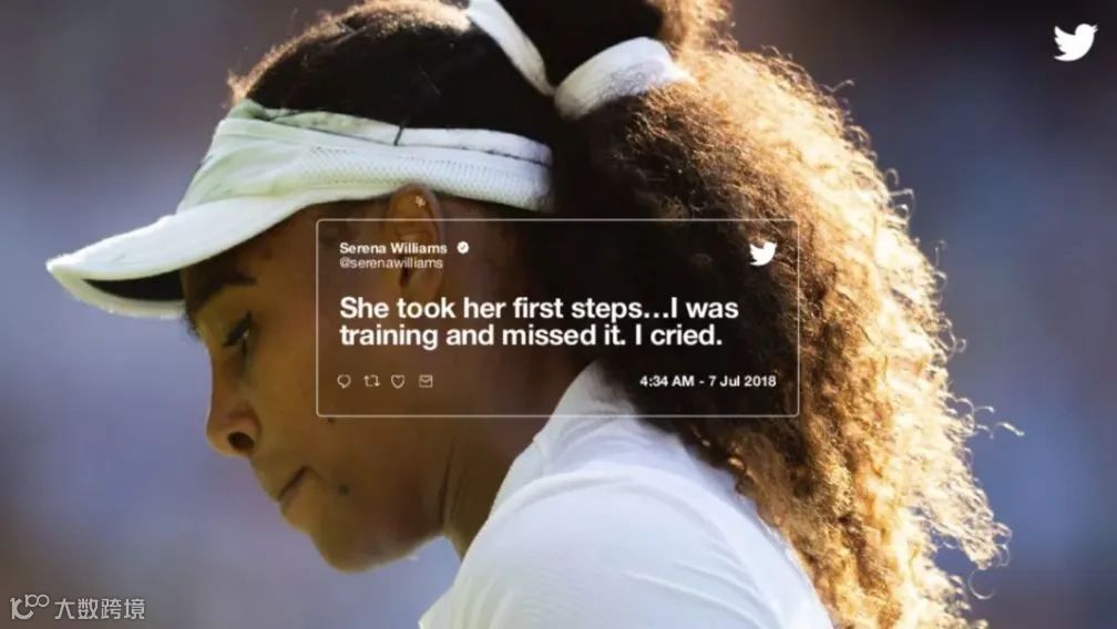 著名网球运动员小威廉姆斯在Twitter上拥有1000多万粉丝,她曾经因为发布的一条遗憾错过女儿第一次走路的推文而引发了广大Twitter用户尤其是有母亲身份用户的共鸣。