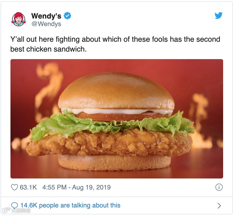 #ChickenWars 发生在2019年,但却是一场Twitter平台典型且成功的社媒营销狂欢。参与其中的品牌包括炸鸡品牌Popeyes、快餐品牌Chick-fil-a和Wendy's等。