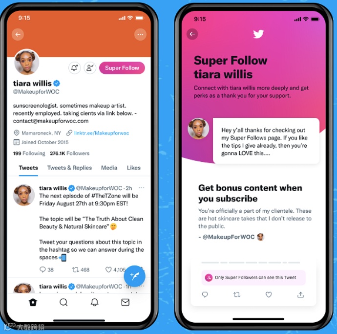 9月1日,Twitter推出“超级关注者”付费订阅功能,用户付费订阅某一“超级关注者”账号后,可以看到其特定的付费内容。对提升平台KOL收入和粘性、提升用户获取的内容质量都有所提升。