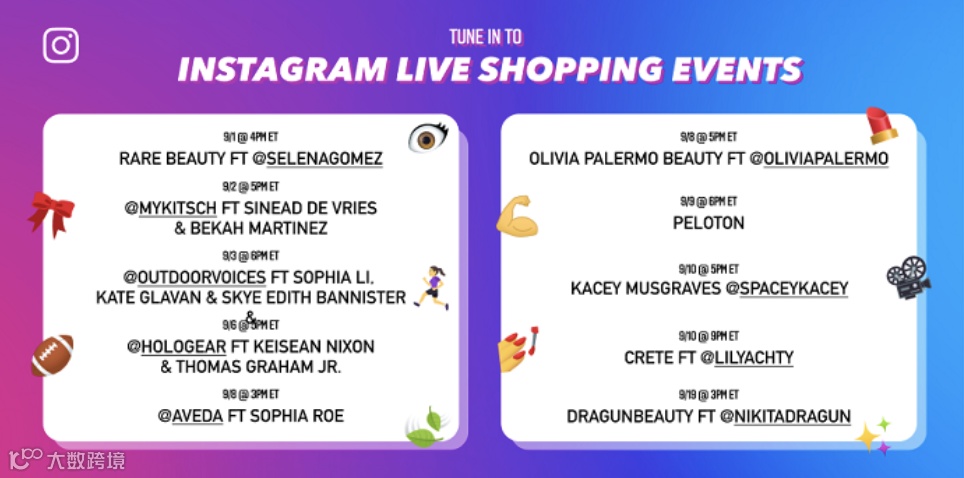 9月1日至10日,Instagram邀请10位不同的红人及品牌,进行商业直播。通过“商店”→“Live”选项就能进入直播观看,在观看的途中也能实现“边看边买",IG平台开始直播带货尝试。