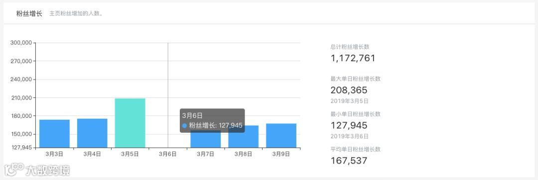 上周的粉丝增长图表,即使最少的一天,粉丝增长也多达12.79万