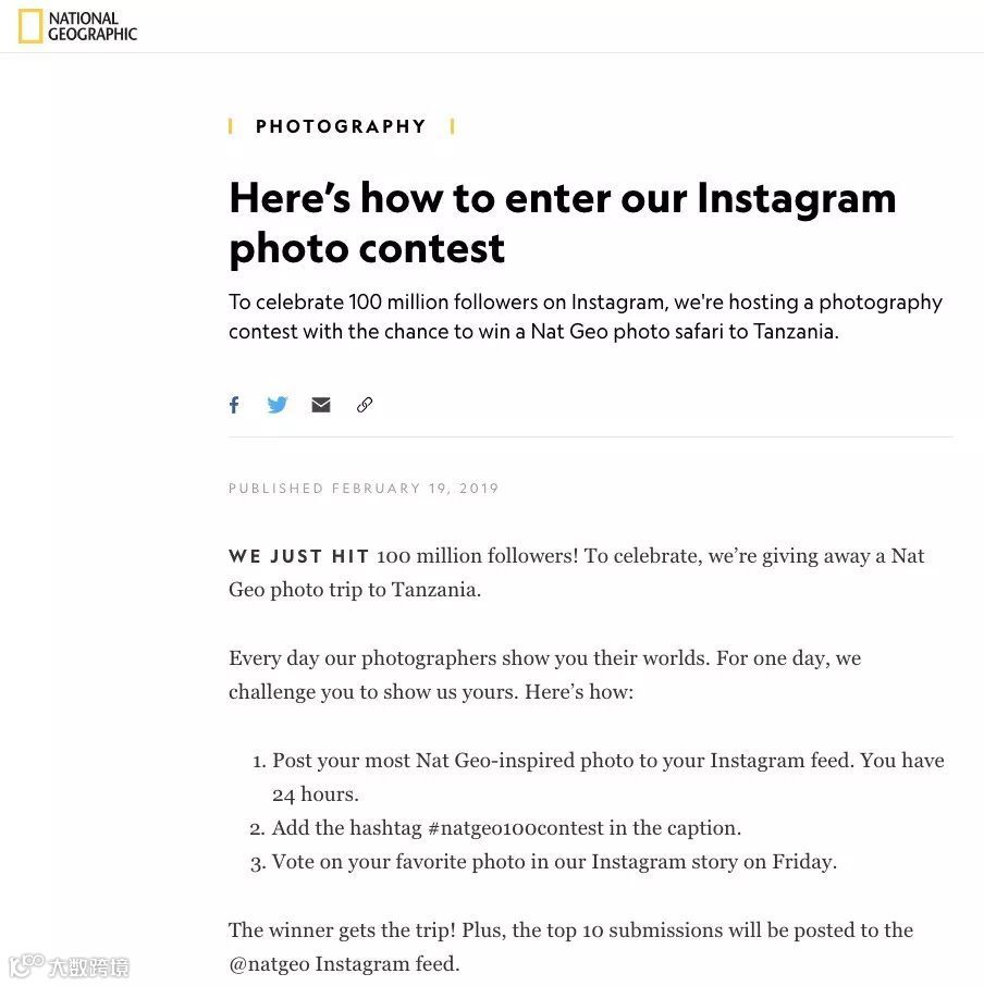 比赛要求参加者使用#natgeo100contest标签在Instagram上分享自己最受Nat Geo启发的照片,参加者有机会赢取坦桑尼亚的Nat Geo照片野生动物园之旅。