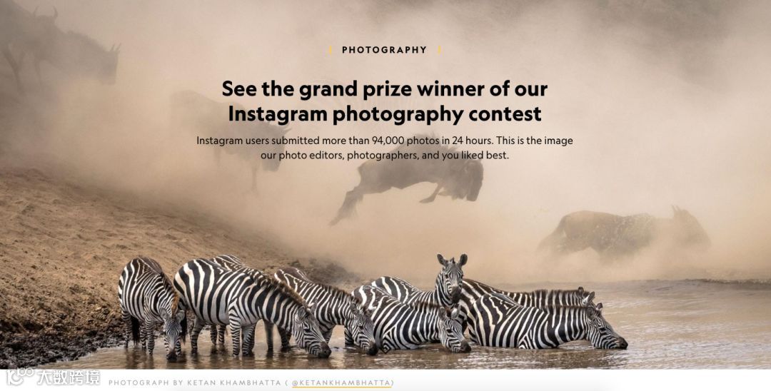 Nat Geo在社交媒体上做的另一个动作,是在Instagram粉丝达到1亿时举办摄影大赛(The National Geographic “100 Million” Contest)。