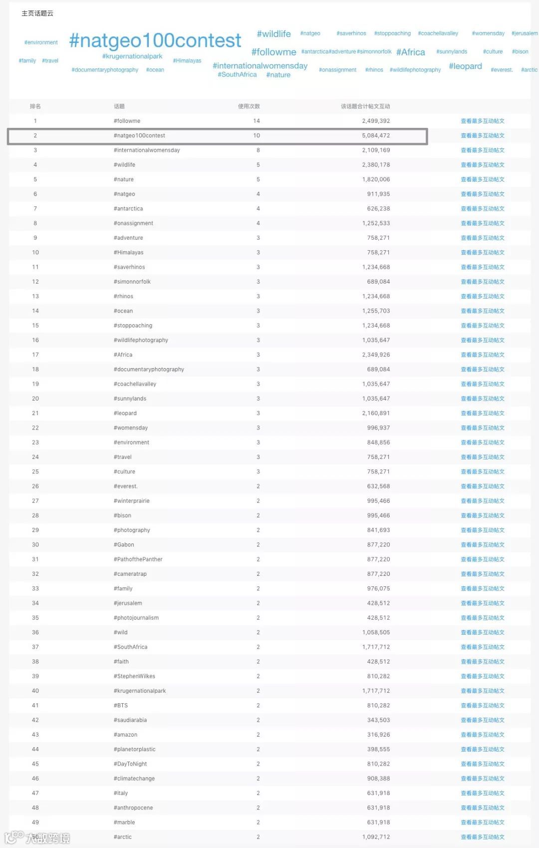 含有#natgeo100contest标签的帖文,互动高达500多万次,远超其他话题