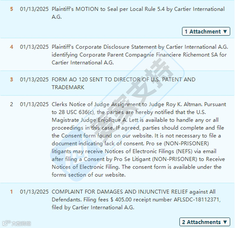 专注于奢侈品牌维权的律所SMG再放大招,代理Cartier International A.G. 商标维权再回归,要知道被SMG律所TRO冻结之后,和解的成本是非常高昂的,目前该案件处于刚立案阶段,暂未冻结,跨境卖家速速排查。
