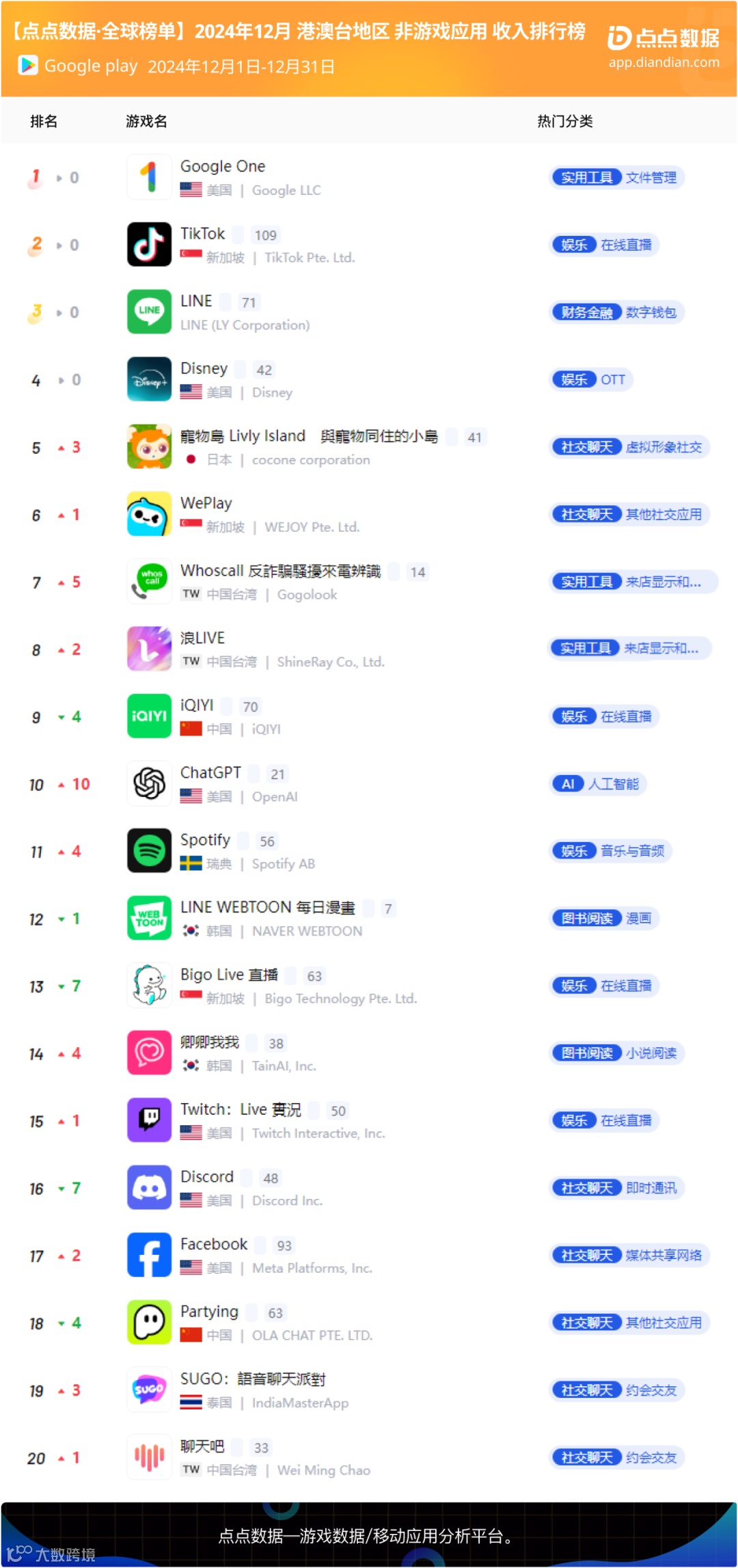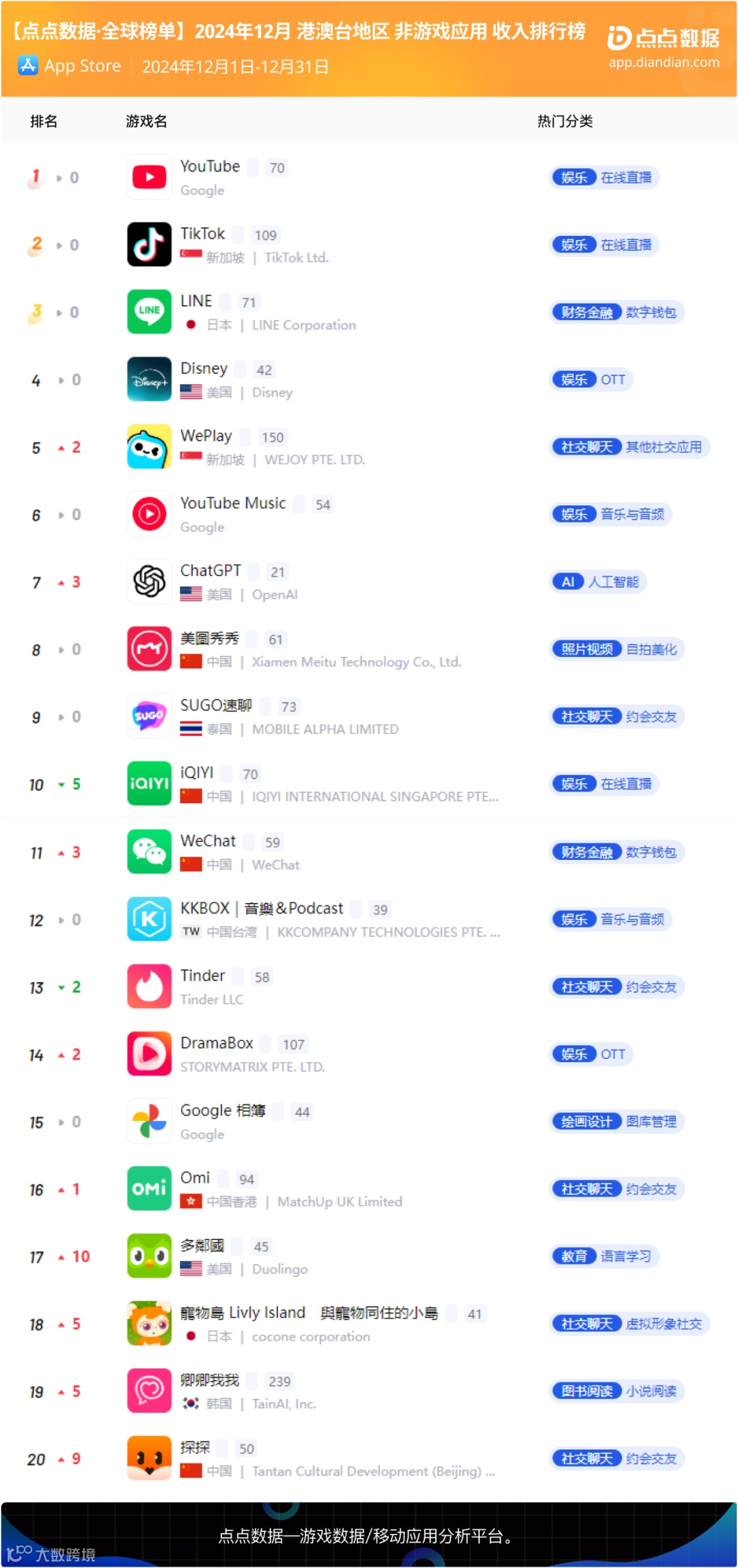 统计周期内,十二月港澳台地区应用收入冠军依旧由短视频社交应用《TikTok》蝉联,其上月预估总收入超过373万美元。双平台收入榜冠军也未发生变化,分别为音视频社交应用《YouTube》和谷歌官方应用《Google One》,以上三款应用月收入数据皆有回暖。