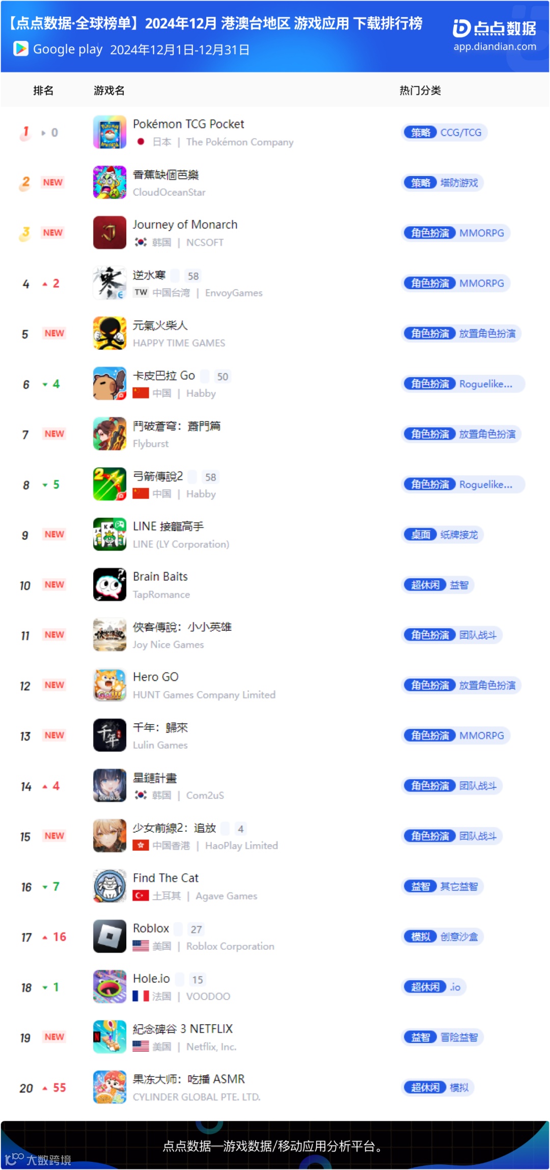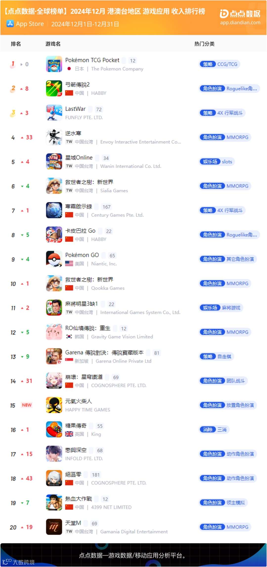 统计周期内,中韩两地依旧在全球新游市场里占据主导地位,上月也依旧有数款新游产品登上本地游戏应用榜单。但与此同时,上月港澳台地区手游市场里,数款年中、乃至年初上线的手游产品纷纷翻红,使得本地区手游下载榜上榜应用变化依旧活跃。