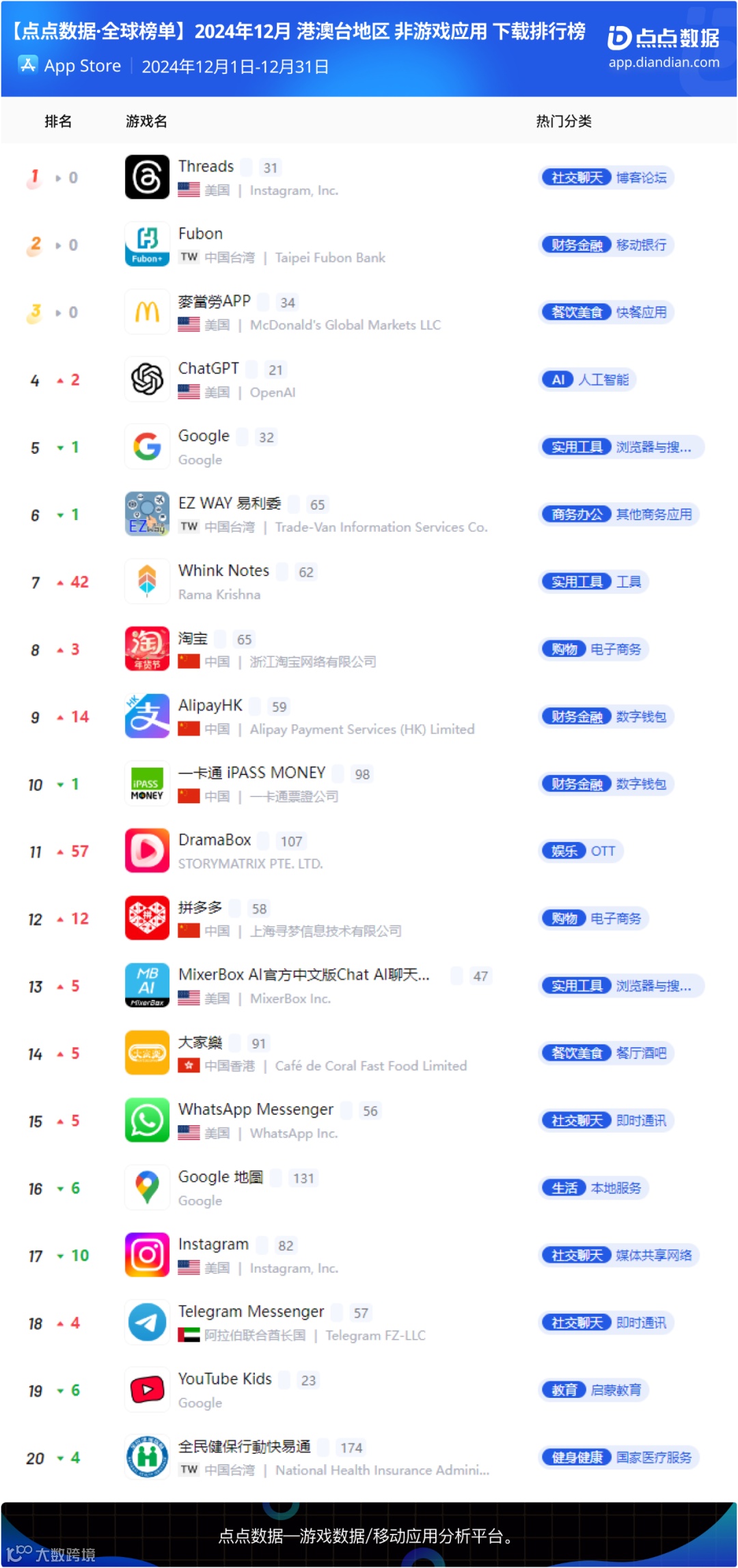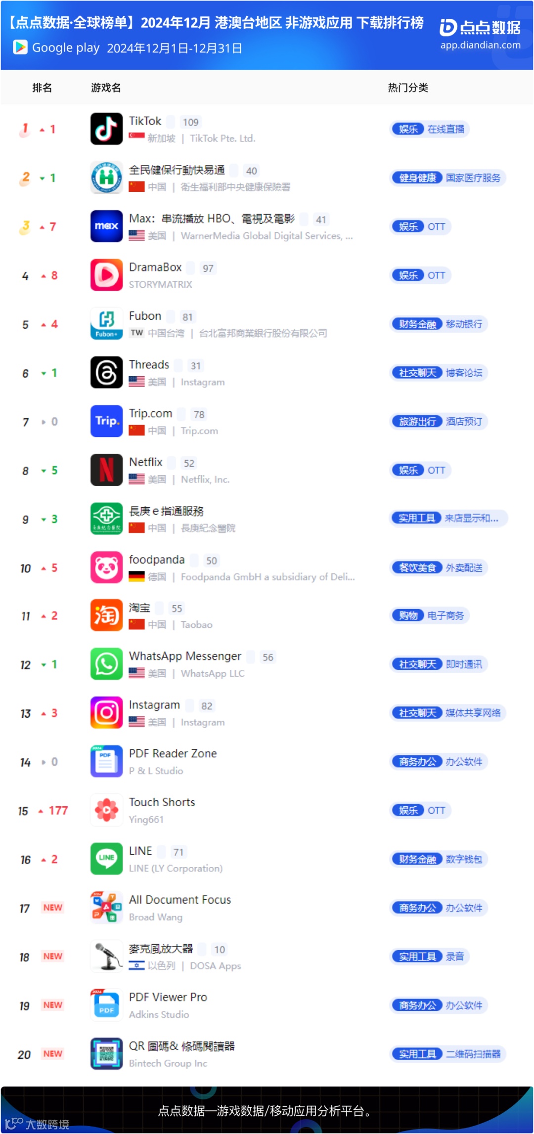 十二月港澳台地区非游应用下载冠军再次由Meta旗下文字社交应用《Threads》蝉联,其十一月下载总量再度下滑至39万,其中App Store单平台下载量降幅最为明显。Google Play下载榜冠军则由为字节旗下短视频社交应用《TikTok》重新夺得,其十一月单平台下载量超过11万。