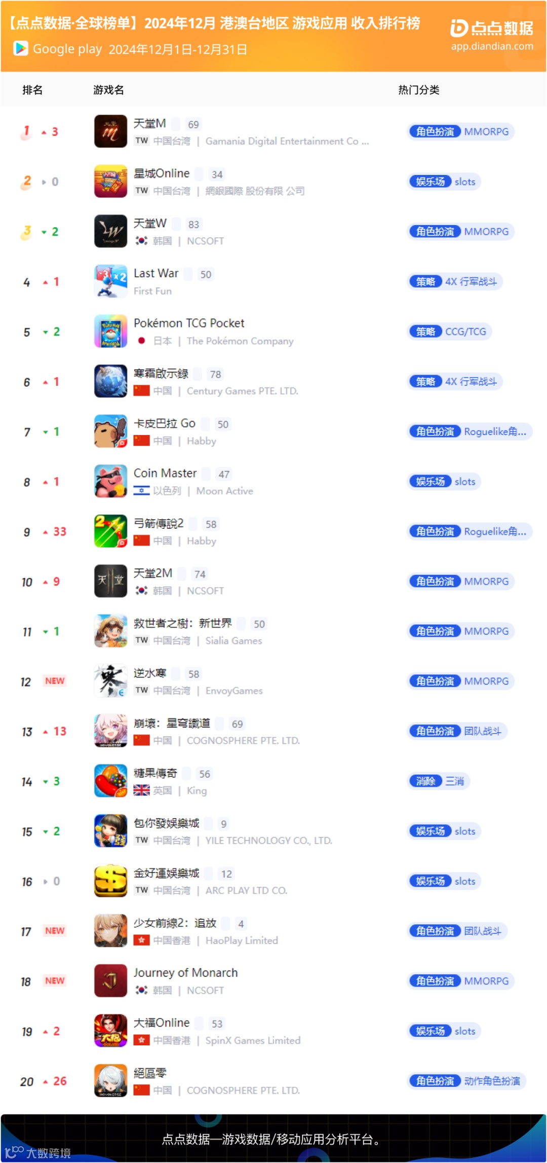 于十一月底上线,上月登顶的《Pokémon TCG Pocket》再次凭借在App Store平台收入数据上的优势蝉联港澳台地区手游收入冠军,其上月在该地区的预估总收入超过1540万美元(约合RMB1.13亿元),宝可梦IP的影响力依旧发挥稳定。Google Play这边手游收入榜冠军则由NCSOFT旗下“天堂”IPMMO《天堂M》摘得。