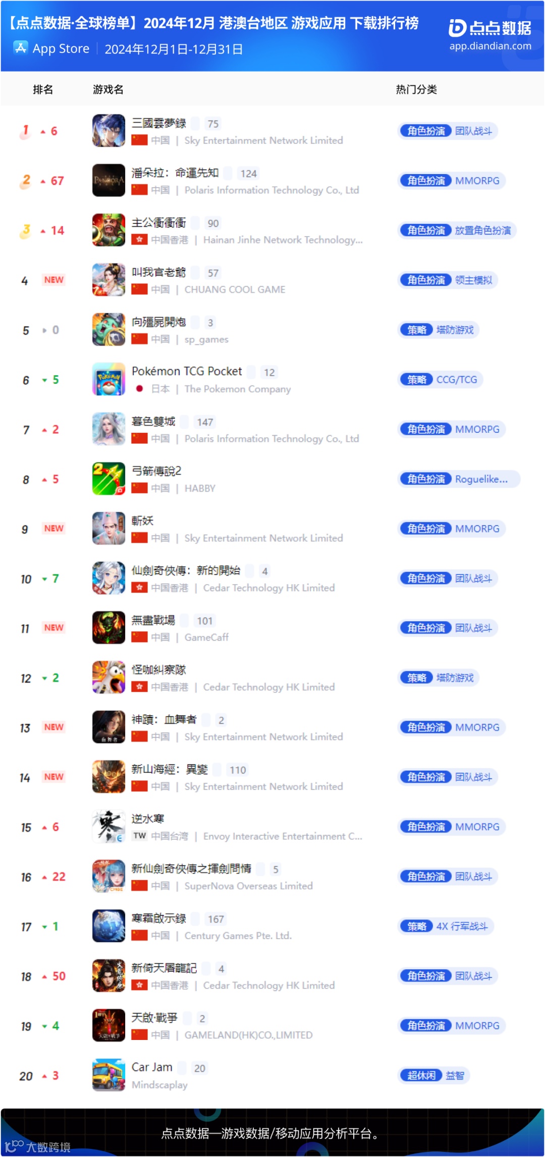 上月港澳台地区手游下载冠军依旧由宝可梦公司自研的集换式卡牌手游《Pokémon TCG Pocket》蝉联,但其下载总量则是跌至此前一个月的一半约48万。App Store下载榜榜首则由天游旗下七月上线的三国题材MMO产品《三國雲夢錄》摘得。