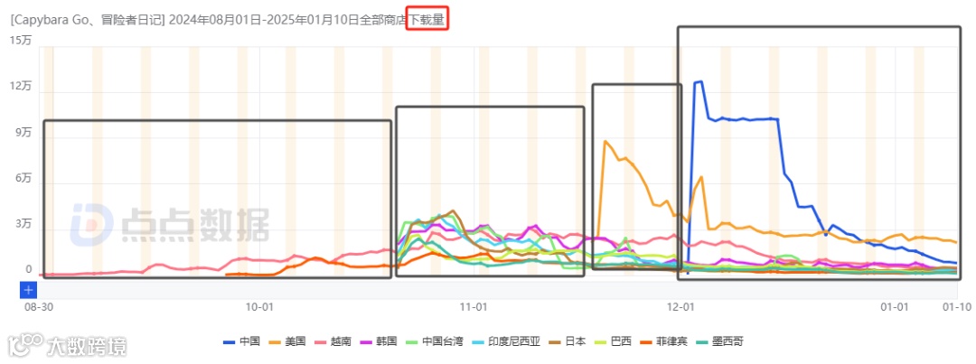 2024年8月底,游戏在越南、加拿大、泰国、新加坡等地开启小规模测试,彼时其日下载量从不到1000逐渐增长到10月中旬的两万多,9月其月下载量与月流水分别为20.3万及121万元;