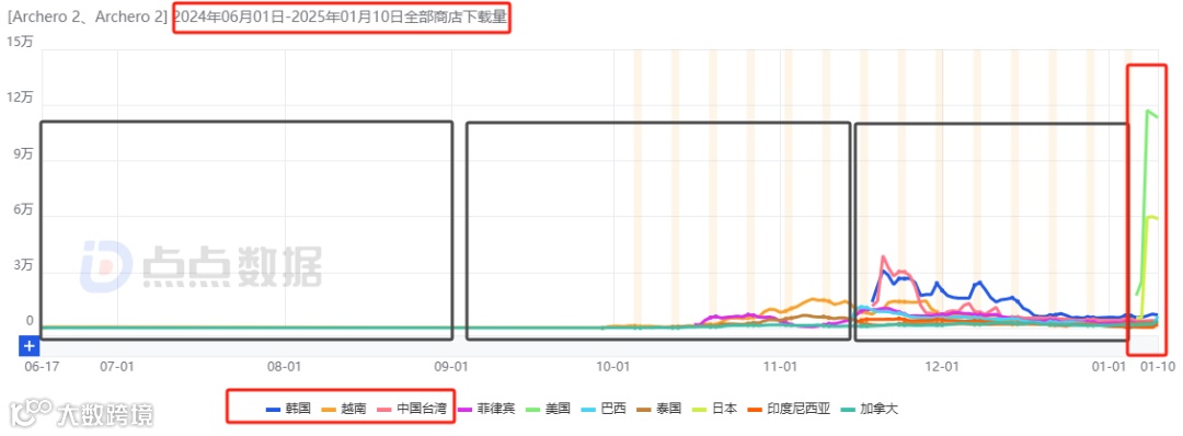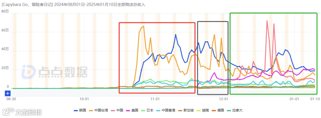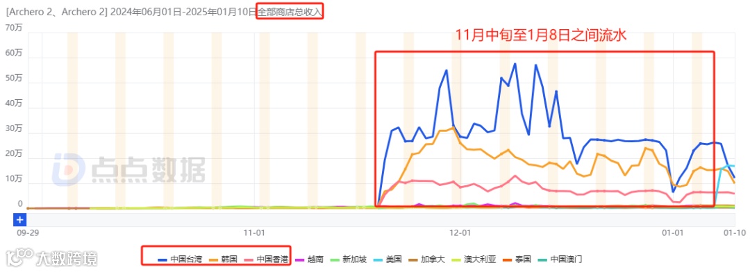 11月及12月下载量分别为154万与133万,11月流水达5595万,环比10月增长了3581%,12月则直接破亿达到1.43亿元。该阶段韩国和中国台湾的贡献开始明显增大;