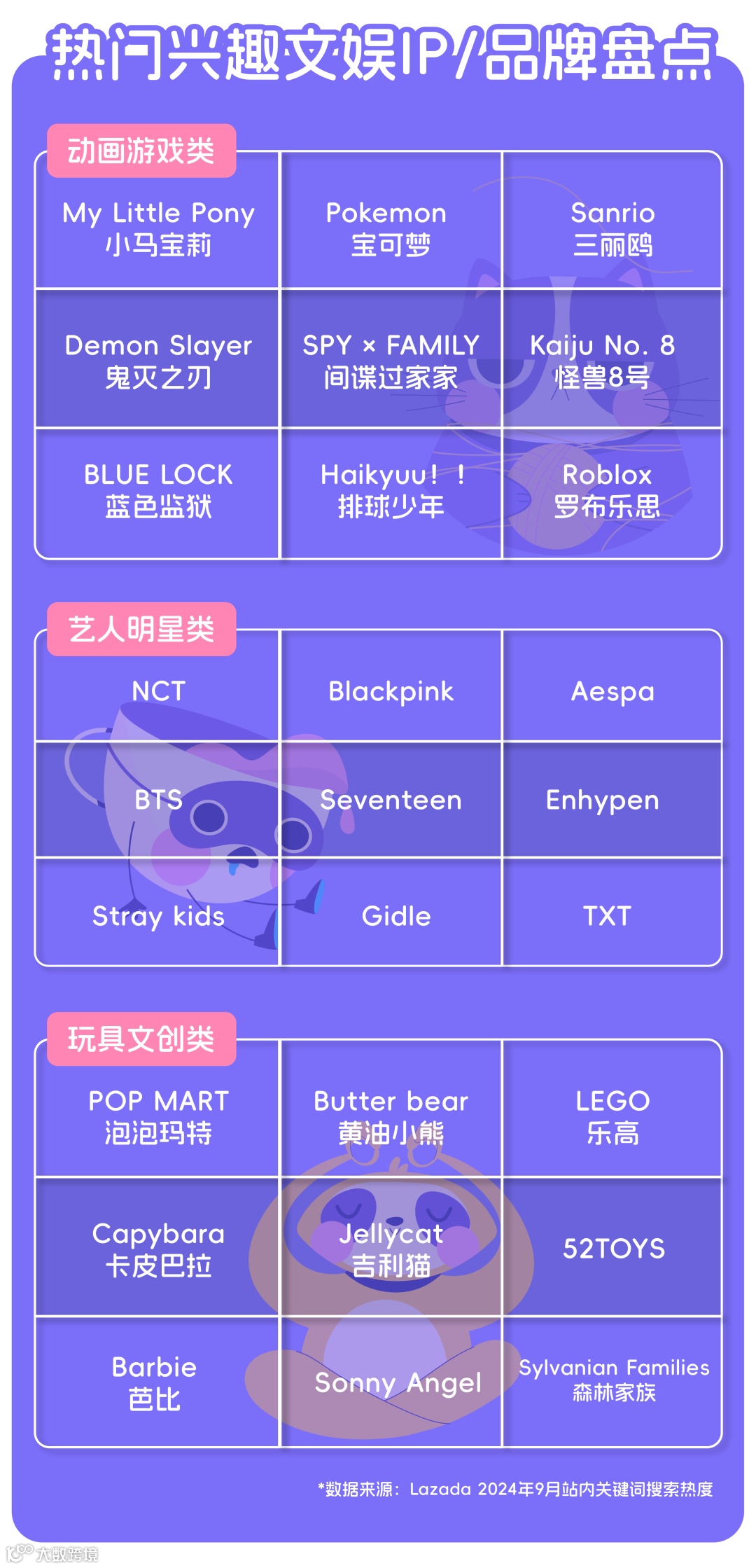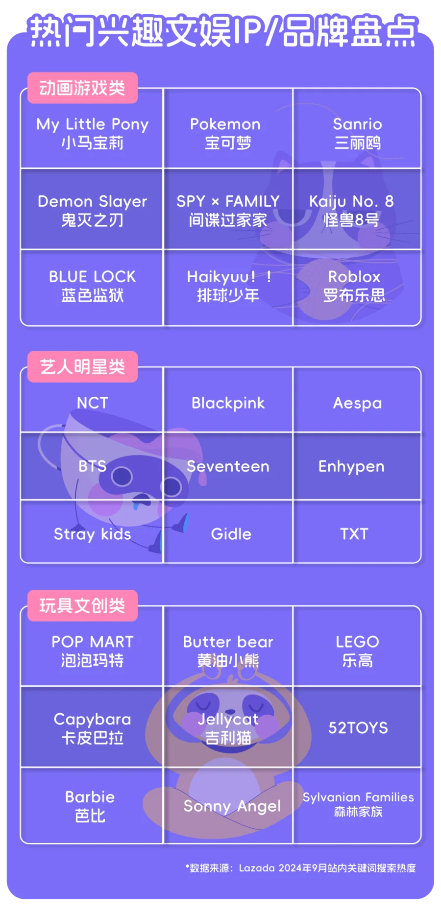 根据Lazada玩具类目各站点搜索关键词热度显示,文娱IP主要可分为三类,包括以动画游戏为主的二次元类、艺人明星类,品牌玩具文创类,并根据三个主要类型汇总了在平台内受欢迎程度较高的热门文娱IP盘点。