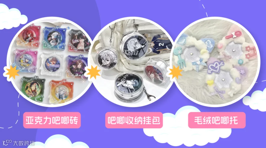 常见的徽章主要尺寸以58mm和75mm为主,除了主流的圆型徽章之外,还会推出爱心形、星星形、方形、椭圆形的异形徽章等。为了更好的展示产品自身的元素,大部分徽章谷美多以透明亚克力砖、塑料PVC挂包挂袋为主;而为了营造周边的层次感和氛围感,毛绒型的吧唧托也颇受爱好者的欢迎。
