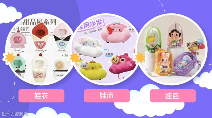 常见的娃娃衍生产品包括装饰类的娃衣,娃床,以及收纳类的娃包、透明展示柜等。在装饰类的产品中,主要突出的是场景化与主题化,例如甜品屋系列娃衣、万圣节装扮系列等,除了娃娃衣服之外,娃用手提包、墨镜、耳机等配饰装饰也是商家朋友可以进一步拓展的品类空间。