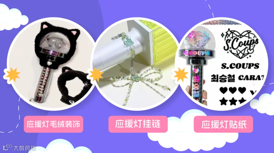 应援灯,就像是粉丝的一张名片,是粉丝表明自我身份的一种象征;一般由偶像所属社进行官方售卖,粉丝在偶像的演唱会及各种线下活动中为其应援而使用的产品,对于粉丝和偶像而言都有重要的意义。因此一系列如毛绒保护套、彩带、串珠、贴纸等等的应援灯装饰物也是粉丝出席各种活动重要装备,商家朋友们可以根据本地演唱会的时间追踪时下市场需求,一般以年末及寒暑假举办的线下活动较为集中。