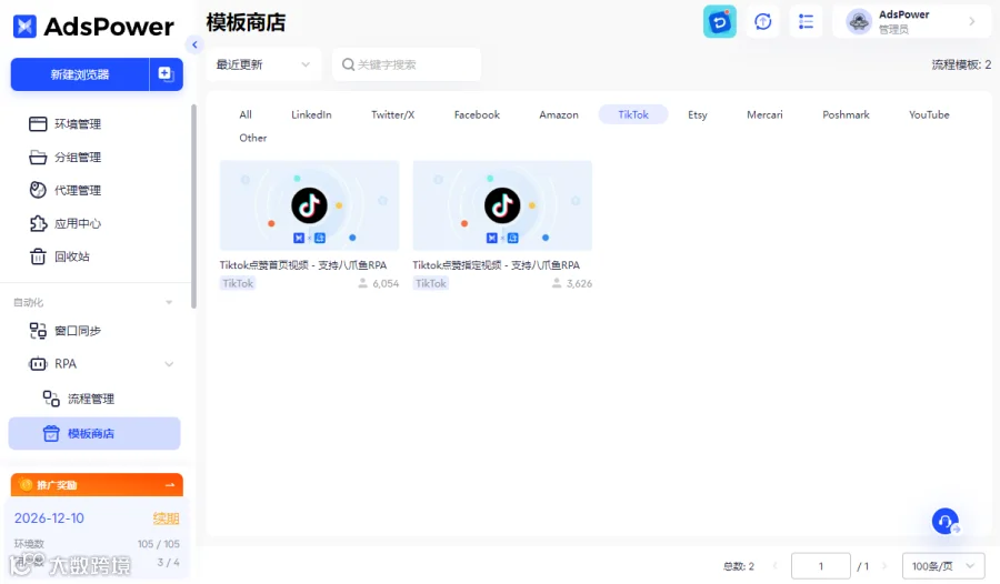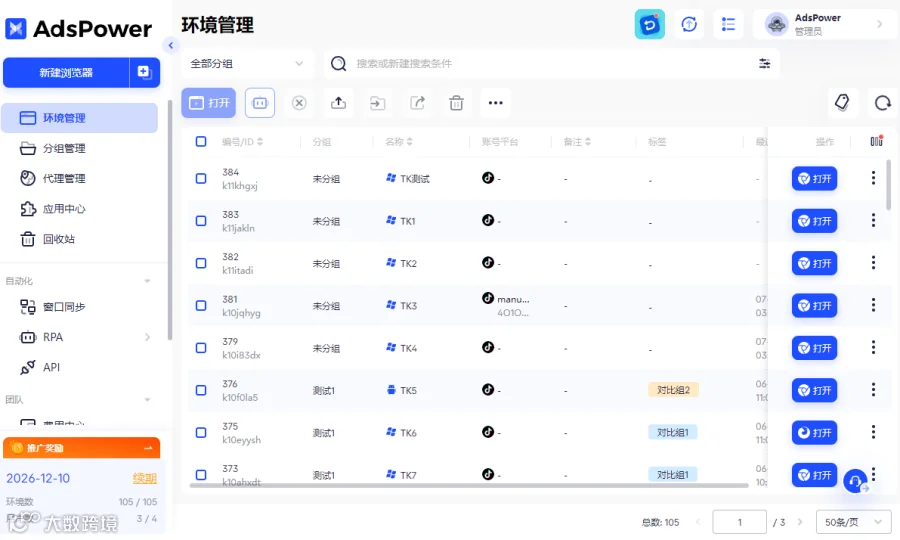 如果你在运营多账号矩阵,可以借助 AdsPower 指纹浏览器来批量管理和高效运营。AdsPower 支持创建多个独立浏览器环境,能够一目了然地管理多个 TikTok 账号,避免账号关联和封号风险。