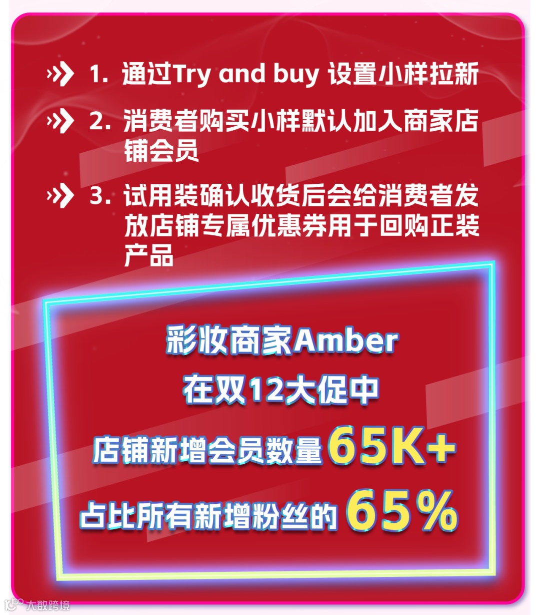Try and buy通过大促活动低单价先试小样后买正装的方式,通过降低消费者对品牌认知的门槛。商家可设置关注店铺/成为店铺会员为购买试用装条件,为店铺增粉,同时消费者在购买试用装确认收货后会收到对应正装商品的优惠券,有助于商家进行复购促销。在双12大促中,便有美妆商家通过Try and buy为店铺新增会员数量65K+,占比所有新增粉丝的65%。