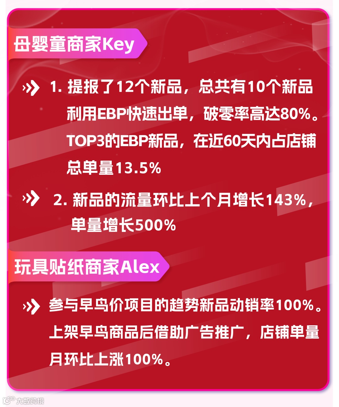 适合有固定上新频率的商家,尽可能的把店铺内的新品都参与到早鸟价(EBP)项目组,借助项目各种优势展示帮助店铺快速开单,从而能固定积累店铺单量,为店铺的销售增长助力。