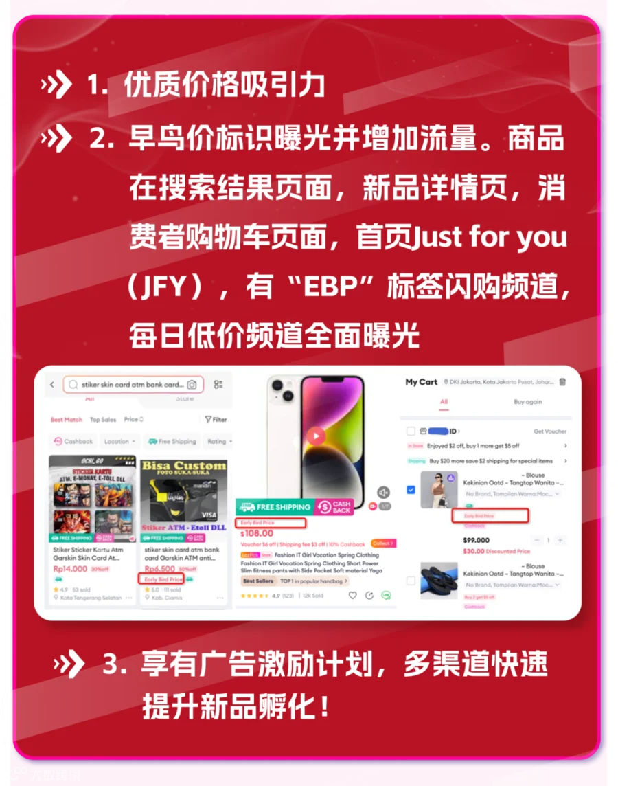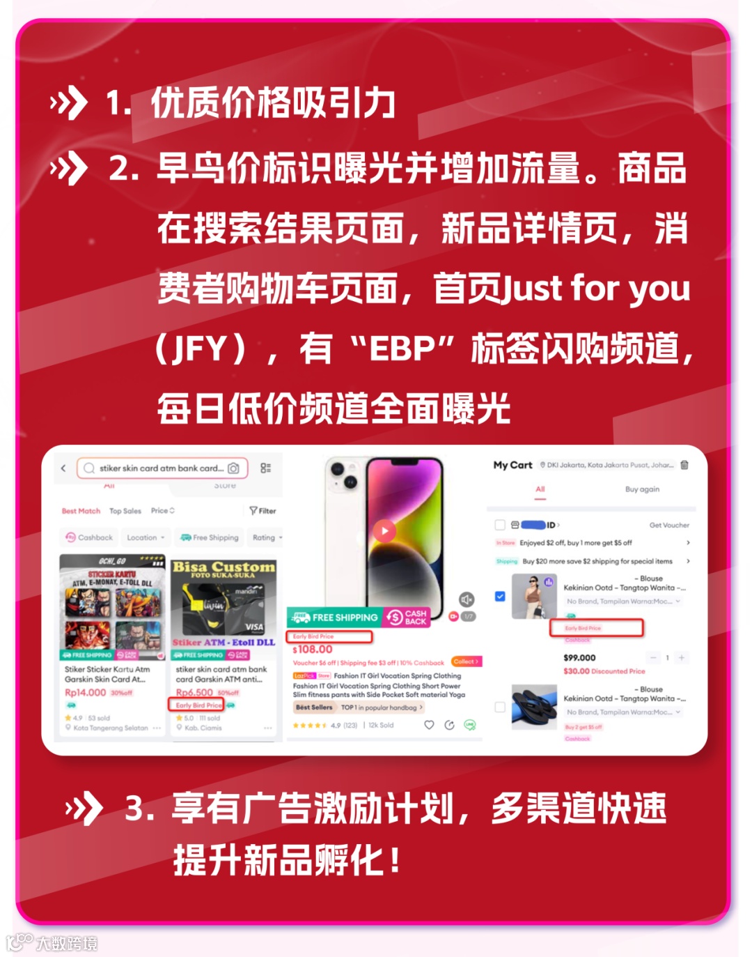 具备价格优势早鸟价新品,曝光转化率更加可观。同时早鸟价新品享受专门标识,消费者在搜索结果、详情页、购物车页面,首页Just for you、“EBP”标签闪购频道、每日低价频道中便能看到,参与早鸟价还能享有广告激励计划,多渠道快速提升新品孵化!