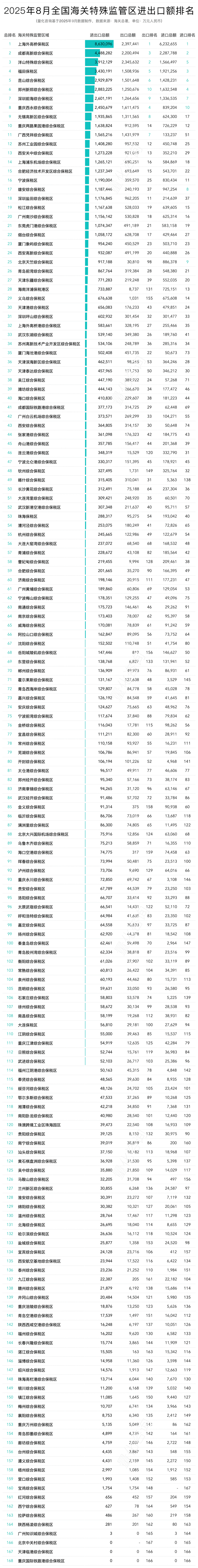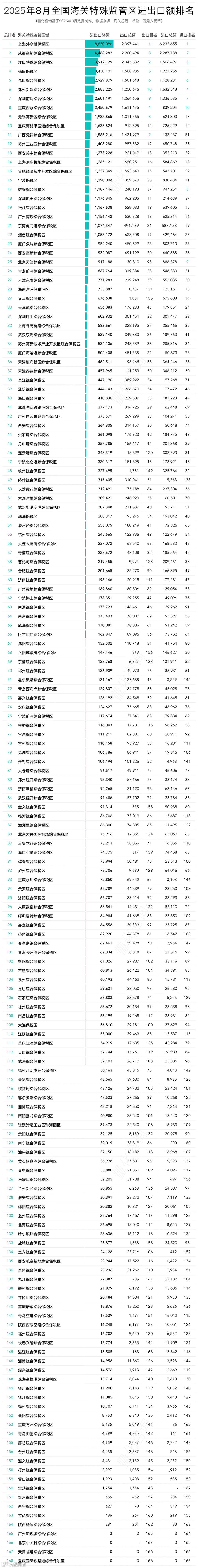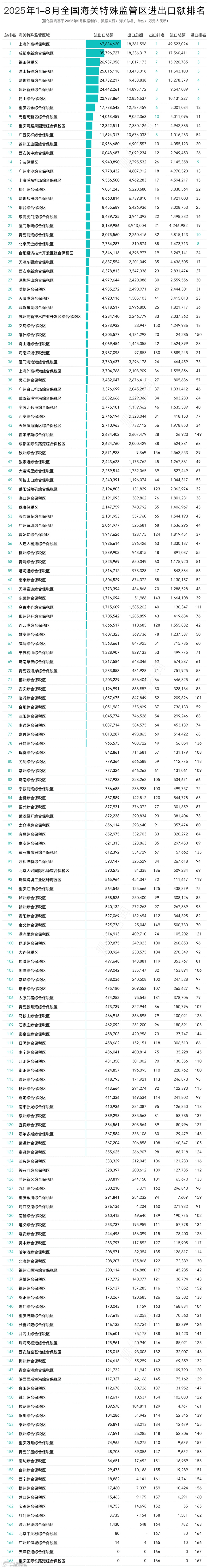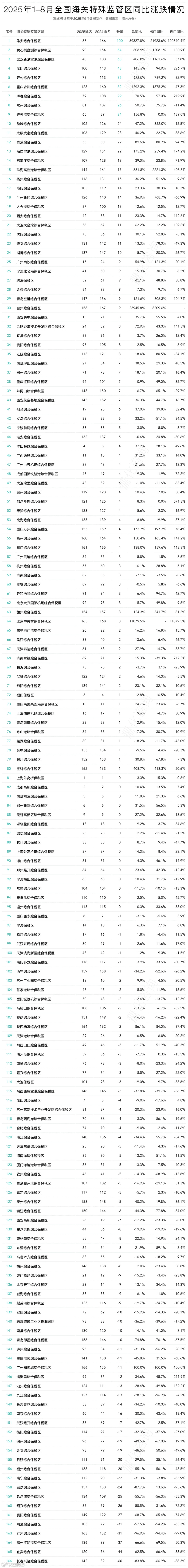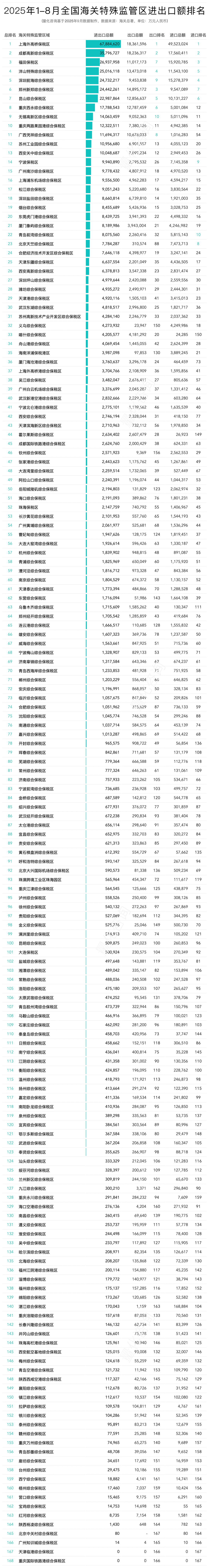 本文量化咨询将基于可统计的168个海关特殊监管区域2025年8月份数据及1-8月汇总数据进行分析排名,主要维度为:8月数据及排名、1-8月综合数据及排名、1-8月同比涨跌及同比排名变化、1-8月各省内特殊监管区域排名及省内占比等。