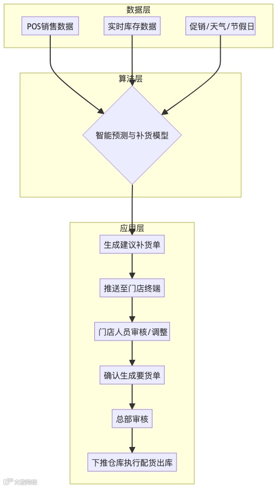 总部不再被动地等待门店申请,而是主动出击。总部的供应链系统会像一个“大脑”,自动汇集所有门店的实时销售数据(POS流水)、库存数据,然后结合一套复杂的算法模型进行计算。