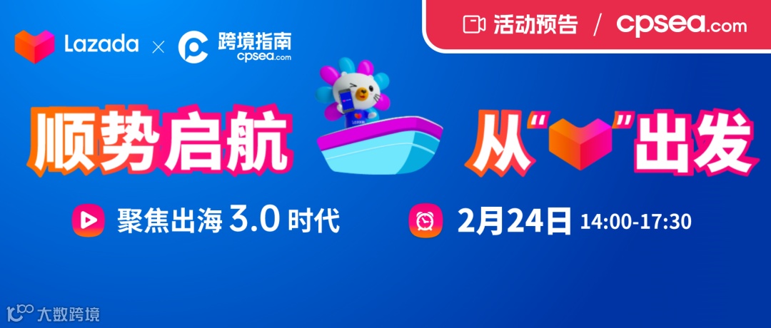 2月24日,Lazada联合跨境指南Cpsea将在线上举办“顺势启航·从心出发丨Lazada 2023聚焦出海3.0时代大会”。
