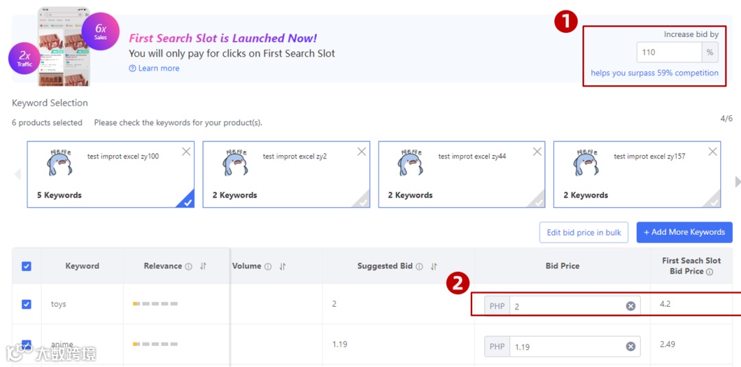 展示位置不可选择,在公平的出价机制下,商家可以选择手动出价大于等于建议值,或者使用自动出价,获得更靠前的曝光。同时,优秀的商品质量分的商品更容易获得靠前的曝光排位,商家也可以选择店铺的头部品优先投放,确保推广效果。