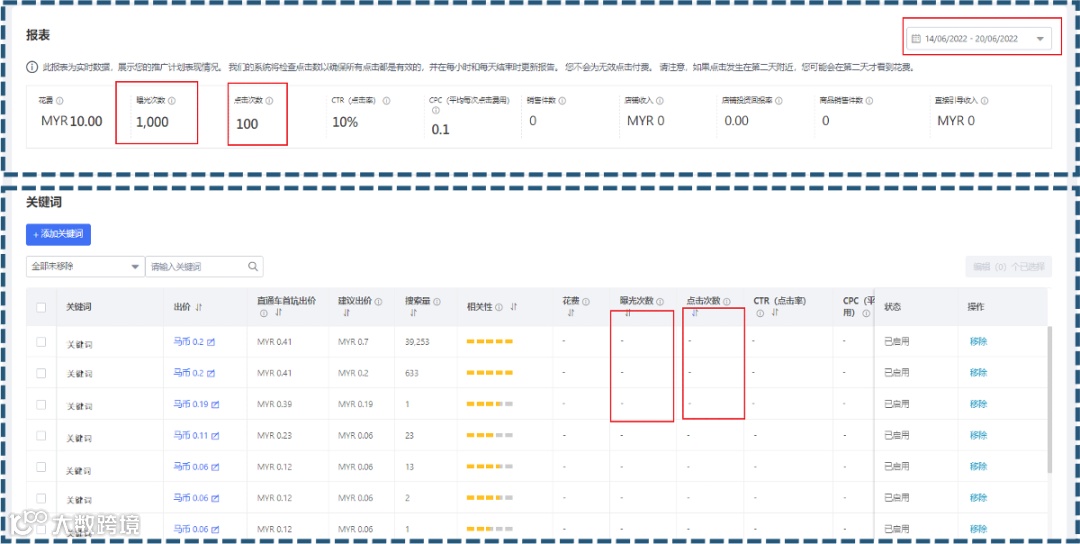 在下方的案例中,报表曝光次数有1000次而关键词数据为0,则代表所有曝光均来自超级推荐,直通车并没有曝光。对此,商家可提高各关键词的出价,优化关键词选词,以提高推广商品在搜索结果页的曝光量。