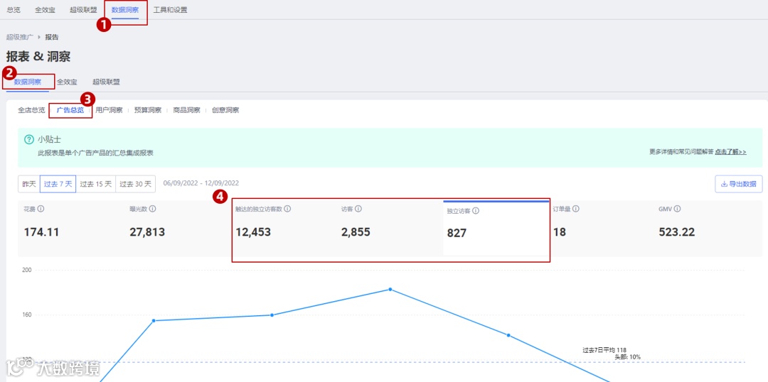 在数据洞察的广告总览中,我们可以看到不同的访客指标。
