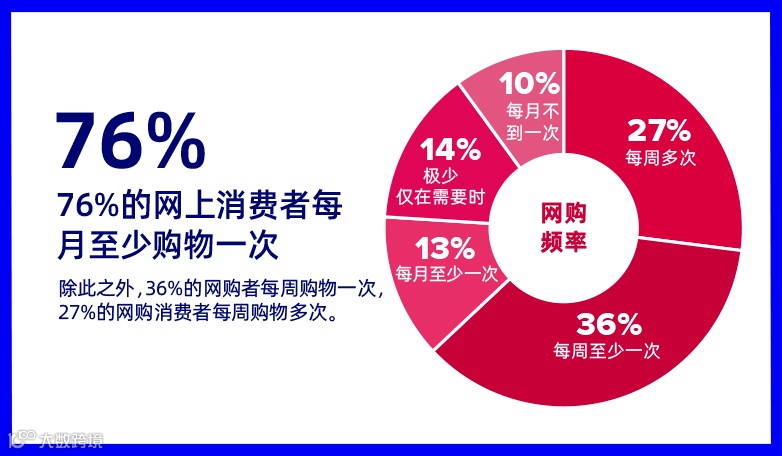 76%的网上消费者每月至少购物一次。除此之外,36%的网购消费者每周购物一次,27%的网购消费者每周购物多次。多数消费者对于网购“老手”。因此品牌商应突出他们期待的因素,如100%的产品真实性、退货保证以及快速免费送货。