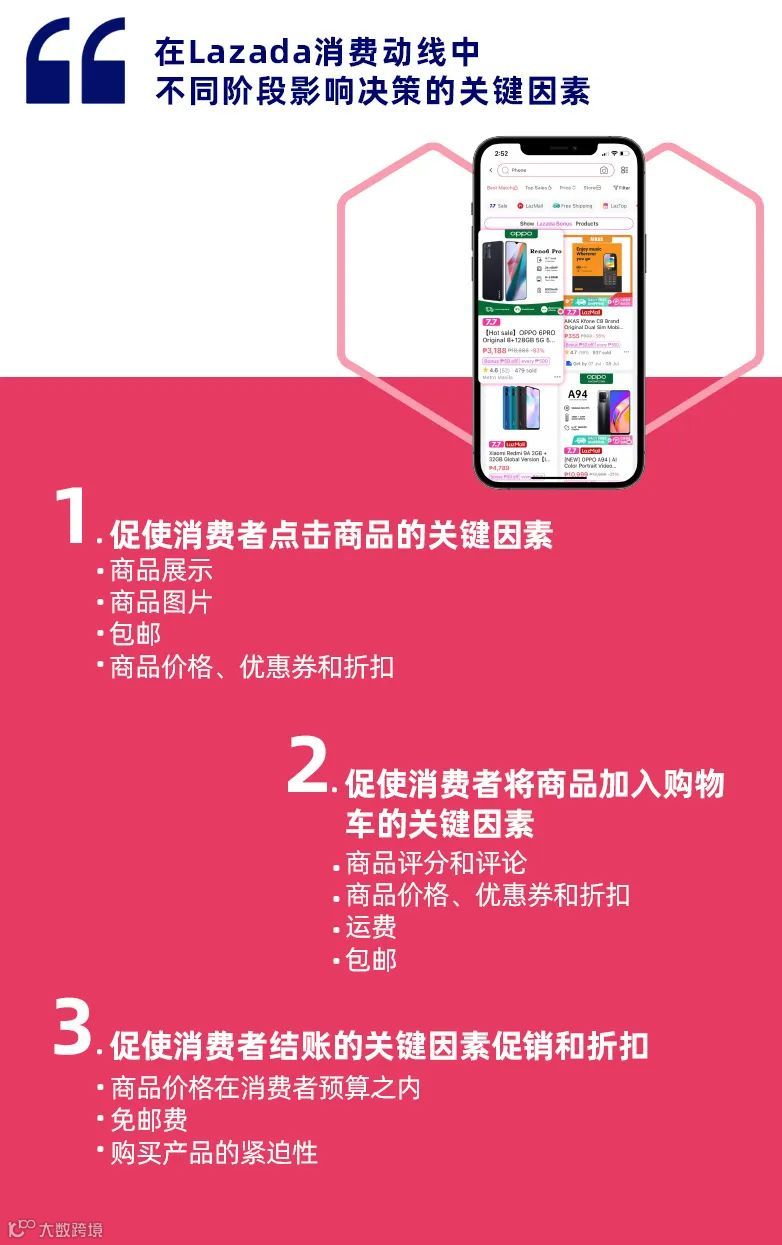 Lazada在东南亚消费者的调查中发现规律:首当其冲便是在上期内容所提及的包邮,无论是对于点击、加购亦或是最后的结账,明显的包邮提示和服务都举足轻重;对于新品牌和新上架的商品而言,获得商品评分和评论也尤为重要,有助于提高可信度,并引导消费者将商品添加到他们的在线购物车中;再者就是折扣和优惠,不完全是越低越好,有时限时限量的优惠销售再加上平台重点展示位,可以为店铺带来不可思议的销量。