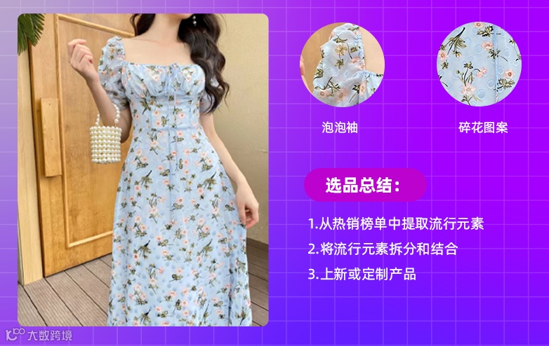 “我们可以通过热销榜单找到准确的流行元素,调研平台头部店铺的热款或根据选款网站的数据去分析消费者喜欢的元素,比如我们发现几款热卖品都有碎花元素,另几款都是泡泡袖,那我们可以将这两种元素结合起来。”翟姐表示。