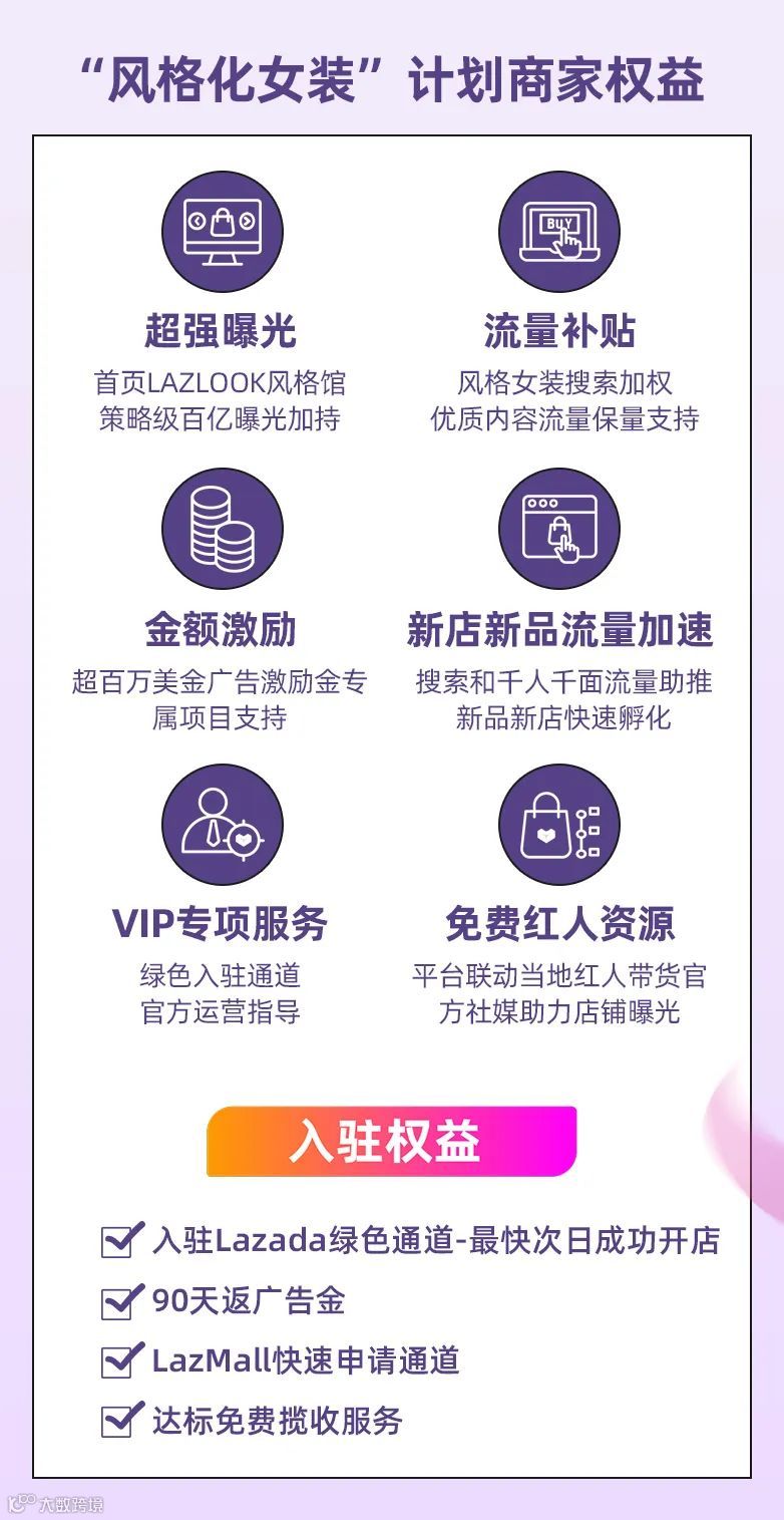 通过此计划,在平台APP首页将设置“LazLook风格馆”通道,用户在Lazada首页就可以进入风格化专区。在风格化的女装商品将拥有流量加权和FEED流量加权,优质商品与内容的访问量将获得保量支持。新品新店在“搜索”和“猜你喜欢”页面通过千人千面的主题卡片的曝光以及专属活动楼层的露出,可实现快速孵化。