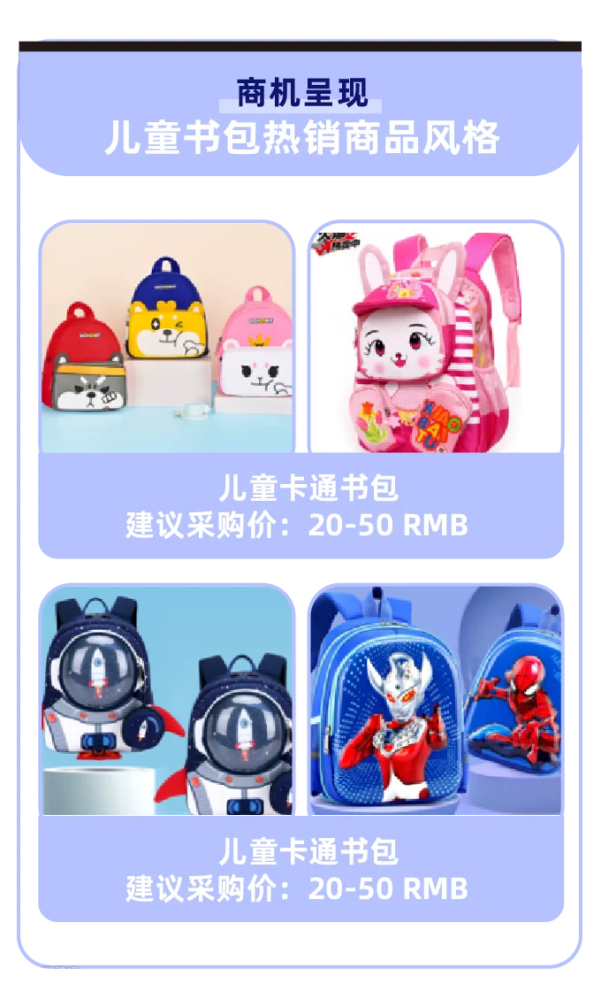 儿童书包使用者为学生,购买决策则是在家长手中。卡通形象/造型书包深受小朋友喜爱,家长在选购上则更注重质量。商家在选品上突出卡通元素毋庸置疑,同时也可以在详情页中突出拉链、缝线等凸显品质的细节。
