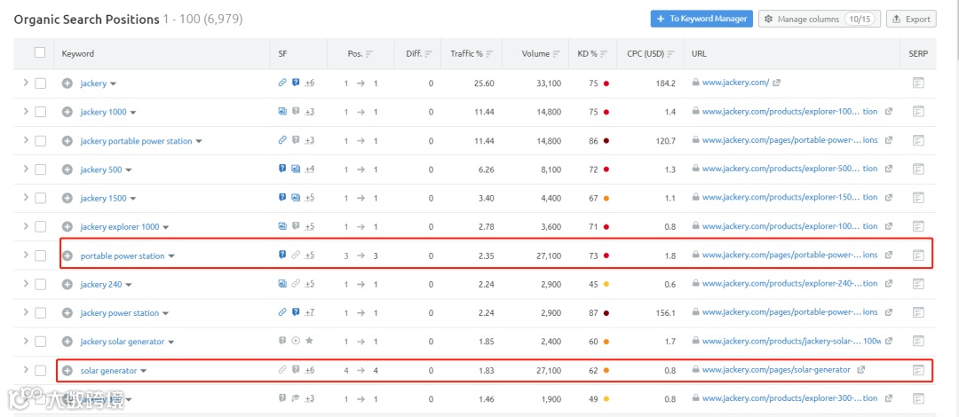 Top5流量页面,包括:首页,产品页面(分别是500w portable power station 及 1000 portable power station这两个产品),以及产品分类页面,下文的分析可以看到分类页面流量主要来自行业词的搜索流量。