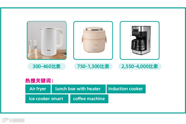 由于大部分消费者选择在家吃和烹饪,所以人们愿意花更多的钱来升级厨具电器。其中,具有色彩美学设计和附加功能的电器目前在市场上暂时稀缺,这将成为跨境商家的优势。此外,在回到办公室办公后,带加热器的电动饭盒需求量将会增加。