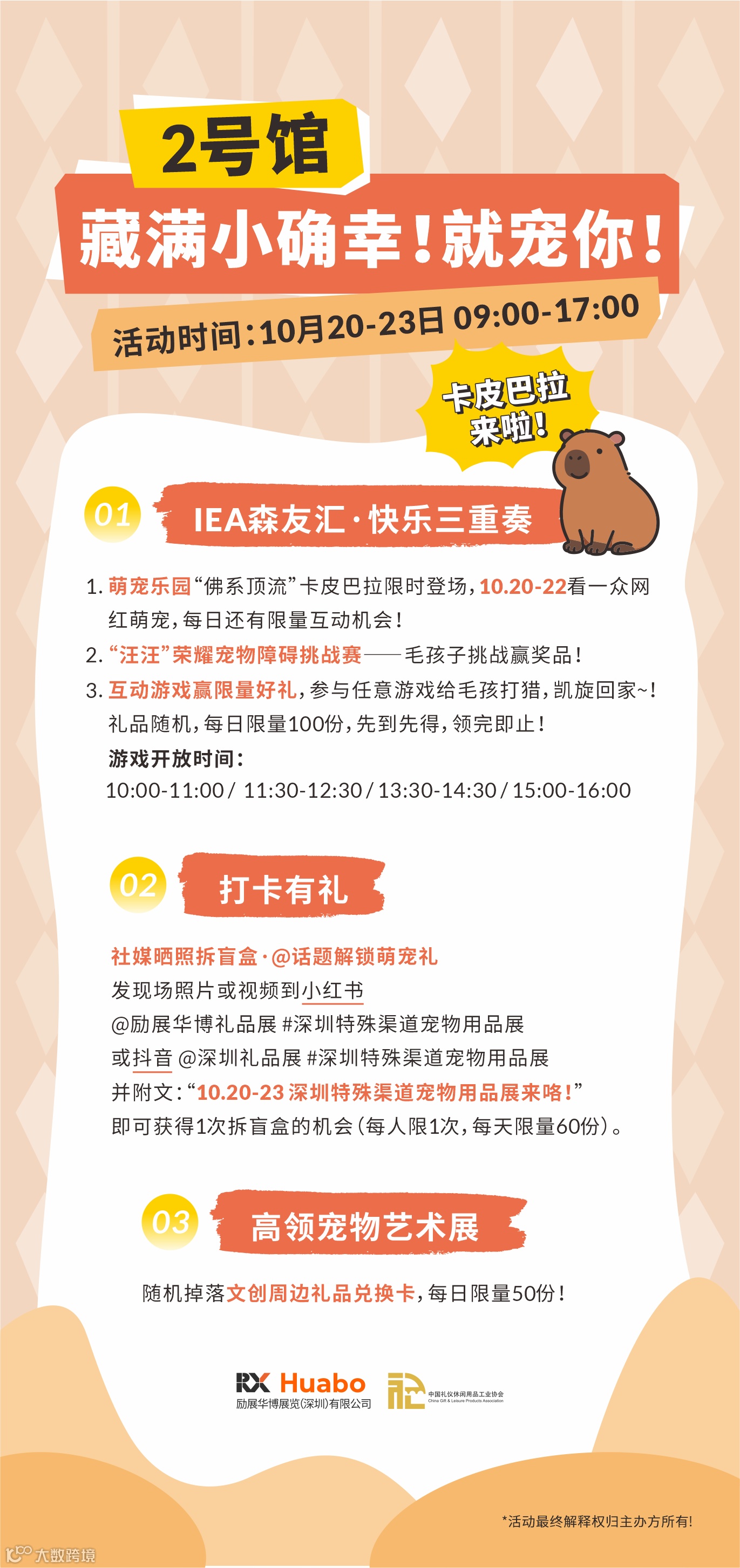 携宠的宝子们只能在2号馆玩儿,其他展馆暂不开放给“毛孩子”进入,感谢理解!