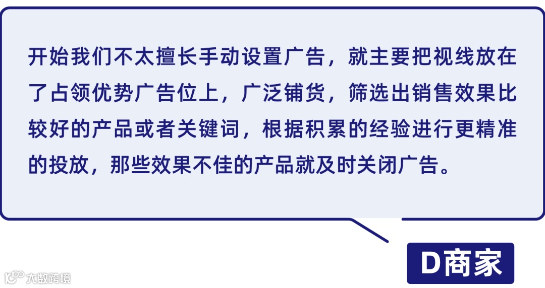 建议有经验的商家投手动广告,采取长尾词,型号词,其他类目相关词等流量较小的词语;如果经验不足,依然建议保持自动广告50%,手动广告50%的比例,每天注意观察关键词的转化率,以此为依据来调整商品价格。
