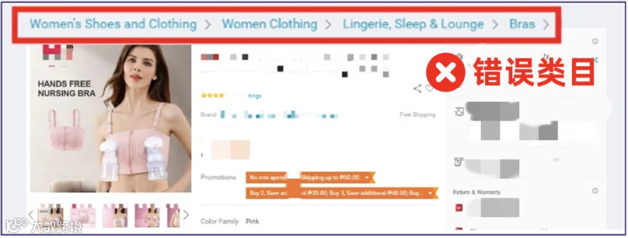 产品属于母婴类目强相关,特定使用和购买人群仅为孕妈,故放在普通文胸类目下错误,正确类目建议为: