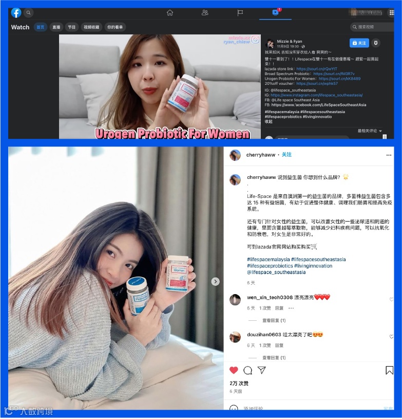 在站外媒体平台传播上,Life-Space更是选择贴合年轻大众喜欢的方式,在大促前Life-Space主要通过口碑传播、平台KOL进行品类教育及推广,在主流社媒平台联合年轻KOL、KOC通过多种形式透出品牌和产品内容,配合更加有趣的益生菌知识传播,输出更多益生菌鲜为人知的功能,以及分享如何甄别益生菌,不断打破东南亚消费者对益生菌的传统观念,围绕“为什么吃”“如何挑选”“什么时候吃”等内容科普并吸引下单,为Lazada店铺带来了可观且优质的流量。