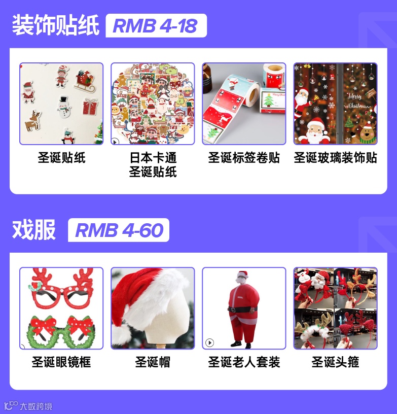 和万圣节的惊悚截然相反,圣诞节热销的商品风格多为温馨风,并且一定带有可辨识的圣诞元素特点,如红绿、圣诞老人、圣诞树、麋鹿、礼物等。结合这些元素设计的卡通装饰贴纸、头饰和戏服是当地消费者常常购买的装饰品。