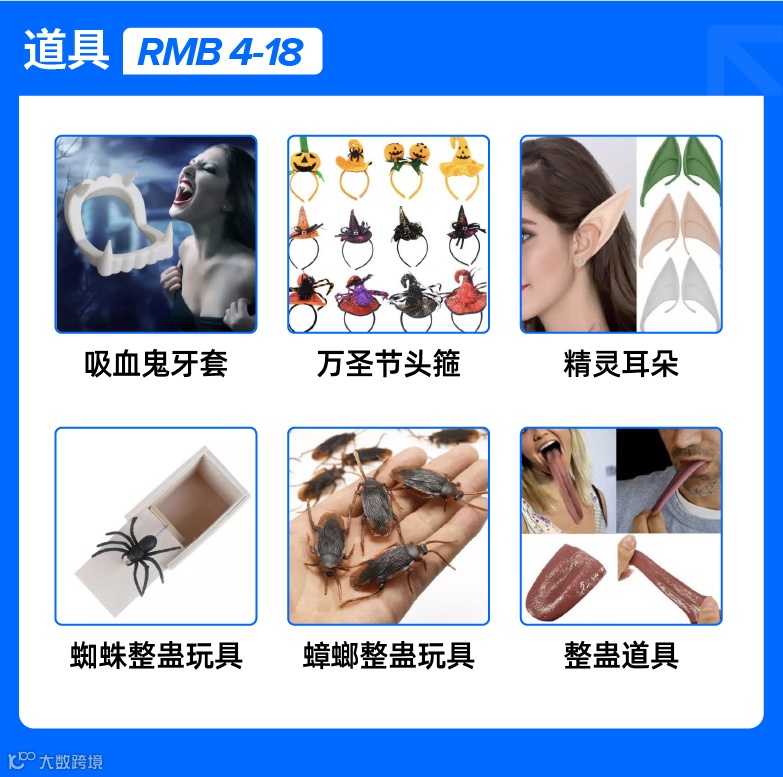 道具在万圣节节前将迎来惊人的消费高峰,包括畅销多年的吸血鬼假牙,万圣节巫师帽、南瓜头箍、精灵耳朵等。另外值得一提的是,一些整蛊道具需求火爆,如假昆虫、模拟器官等等。