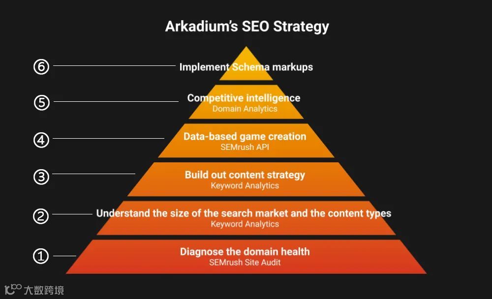 Arkadium的SEO策略采用了类似马洛斯需求原型的架构,从基本的优化开始,到顶端的结构化数据部署及国际化SEO。Arkadium的市场VP Eric认为他们的策略没有什么颠覆性的,主要是遵照了SEO的项目管理及最佳做法。架构如下图所示: