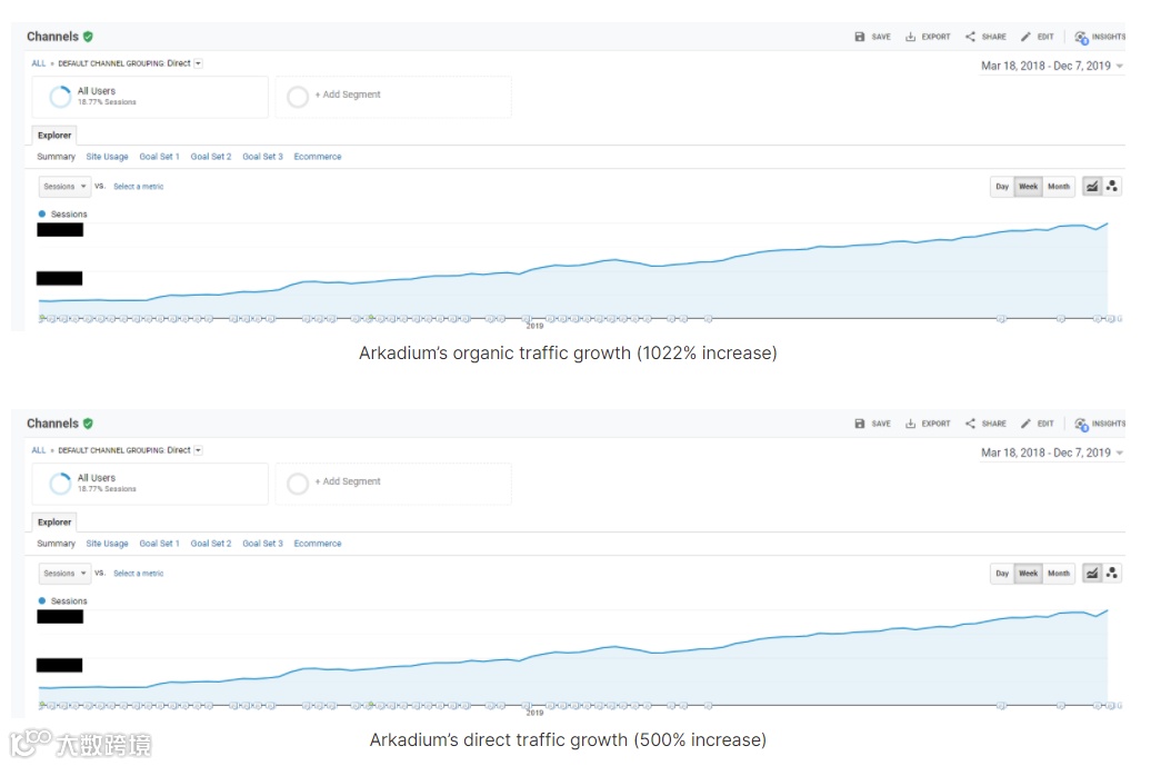 “Arkadium有将近70%的流量来自自然搜索。用户喜欢我们的内容,然后收藏页面后直接访问网站,因此我们的直接访问流量也保持着增长的趋势。下图的流量趋势图可以看到,2018年Q3开始增长,与我们开始使用Semrush, 以及将重心放在SEO渠道上的时间是相吻合的。”