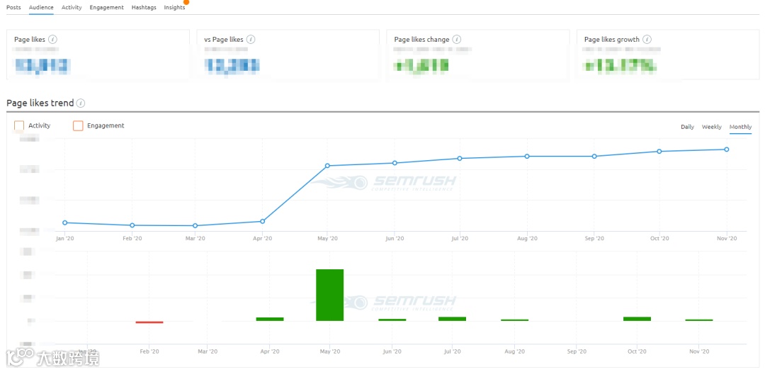 以Facebook平台为例,月均Follows数增长比例5%,年度环比Likes数增长13%;