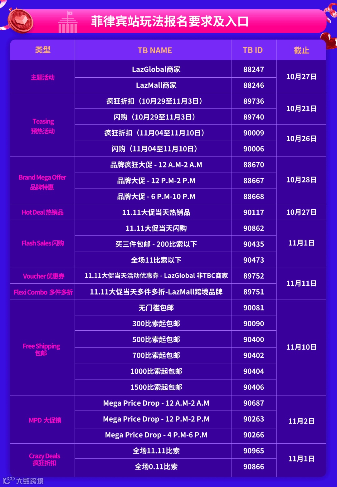 这次的双十一主题促销类型包含经典型、常规型和主题型。每个主题促销会定位不同的品类和玩法,但贯穿整体的永远是Everyday Low Price!闪购、优惠券、裂变券、多样多折、包邮、LazGame、LazLive直播,玩法多样总有一款适合你!想知道各国预热拉新、好物种草、提升客单的秘密,立即和小编一起get六国报名正确姿势!